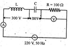 | Seema constructed a series LCR circuit in the laboratory as shown in the diagram. She found that the voltages across the inductor and capacitor are equal when the circuit is connected to an ac source. (a) State the condition at which the voltages across L and C become equal. (b) Obtain an expression for the frequency at which this situation occurs in a series LCR circuit. (c) Find the voltmeter and ammeter readings in the circuit |