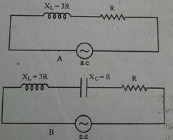 | A) If ‘ω ’ is the angular frequency of a.c., then the reactance offered by inductance ‘L’ and capacitance ‘C’ are respectively, XL =........... and XC = .......... B) An electric bulb and a parallel plate capacitor are connected in series. The bulb glows with some brightness. How will the glow of the bulb be affected on introducing a dielectric slab between the plates of the capacitor? Give reasons in support of your answer. C) Given below are two electric circuits A and B. What is the ratio of power factor of the circuit B to that A? |