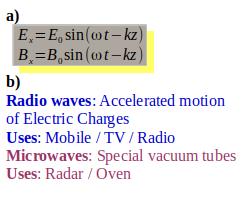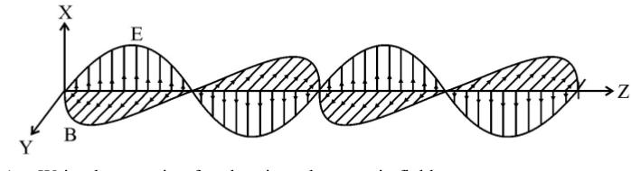| A typical plane electromagnetic wave propagating along the Z direction is shown in figure. (a) Write the equation for electric and magnetic fields. (b) Write the methods of production of radio waves and microwaves. Write any one use of these waves. |