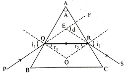 | A ray of light passing through a prism. If the refracted ray OR is parallel to the base BC, as shown in figure. (a) Derive an expression to find out deviation (d). (b) Draw a graph which shows the variation of d with i (c) Calculate the angle of minimum deviation if A = 60° and refractive index of the material of prism is 1.62. |