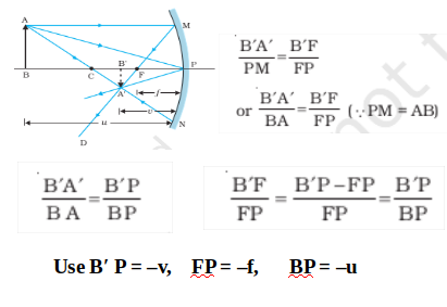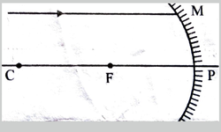 | A ray of light parallel to the principal axis of a spherical mirror falls at a point M as shown in the figure (a) Identify the type of mirror used in the diagram (b) By drawing a suitable ray diagram, obtain the mirror equation. (c) If the mirror is immersed in water, its focal length ................ (increases / decreases / remain the same) |
