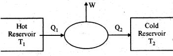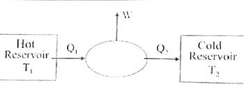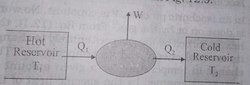 | Figure given depicts the schematic representation of an engine. a) Which type of engine is this, a heat engine or a refrigerator? b) Write the four steps of operation in the Carnot cycle. c) A Carnot engine is working between temperatures of 270 C and 3270 C . Find it efficiency. |