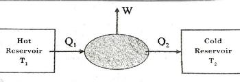 | Schematic diagram of a heat engine is shown a) Modify the given diagram for a refrigerator b) Write the equation for the coefficient of performance of a refrigerator c) In the given diagram, T1 =900K, T2 =300K, Q1 = 6400J / cycle calculate the value of Q2 |