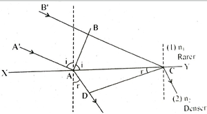 | A plane wave-front AB incident on a surface XY and undergoes refraction as shown in figure (a) Prove Snell"s law of refraction by using this figure (b) What is the change in speed of propagation and frequency of the refracted wave? |
