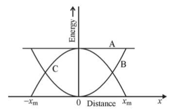 | Graphs of the potential energy, kinetic energy and total energy of an oscillating spring is shown in the figure (a) Find out the potential energy, kinetic energy and total energy from the graph. (b) Derive an expression to find the potential energy of a spring. |